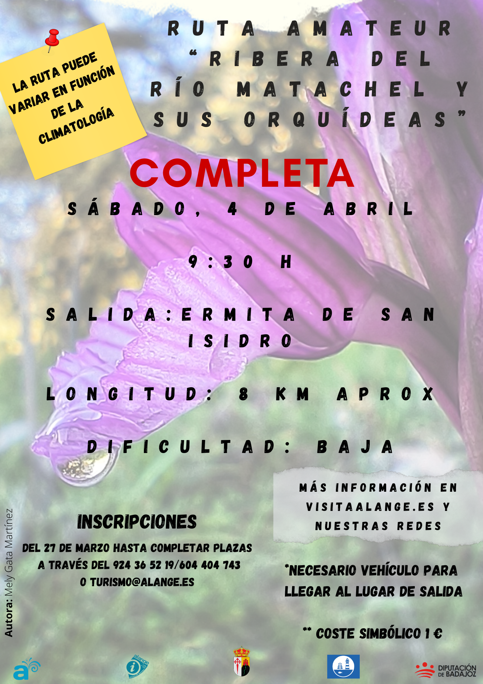 Inscripciones: Del 27 de marzo hasta completar plazas a través de los teléfonos 924 36 52 19 / 604 404 742 o a través del correo electrónico turismo@alange.es indicando nombre completo, edad, teléfono, correo electrónico y lugar de procedencia.