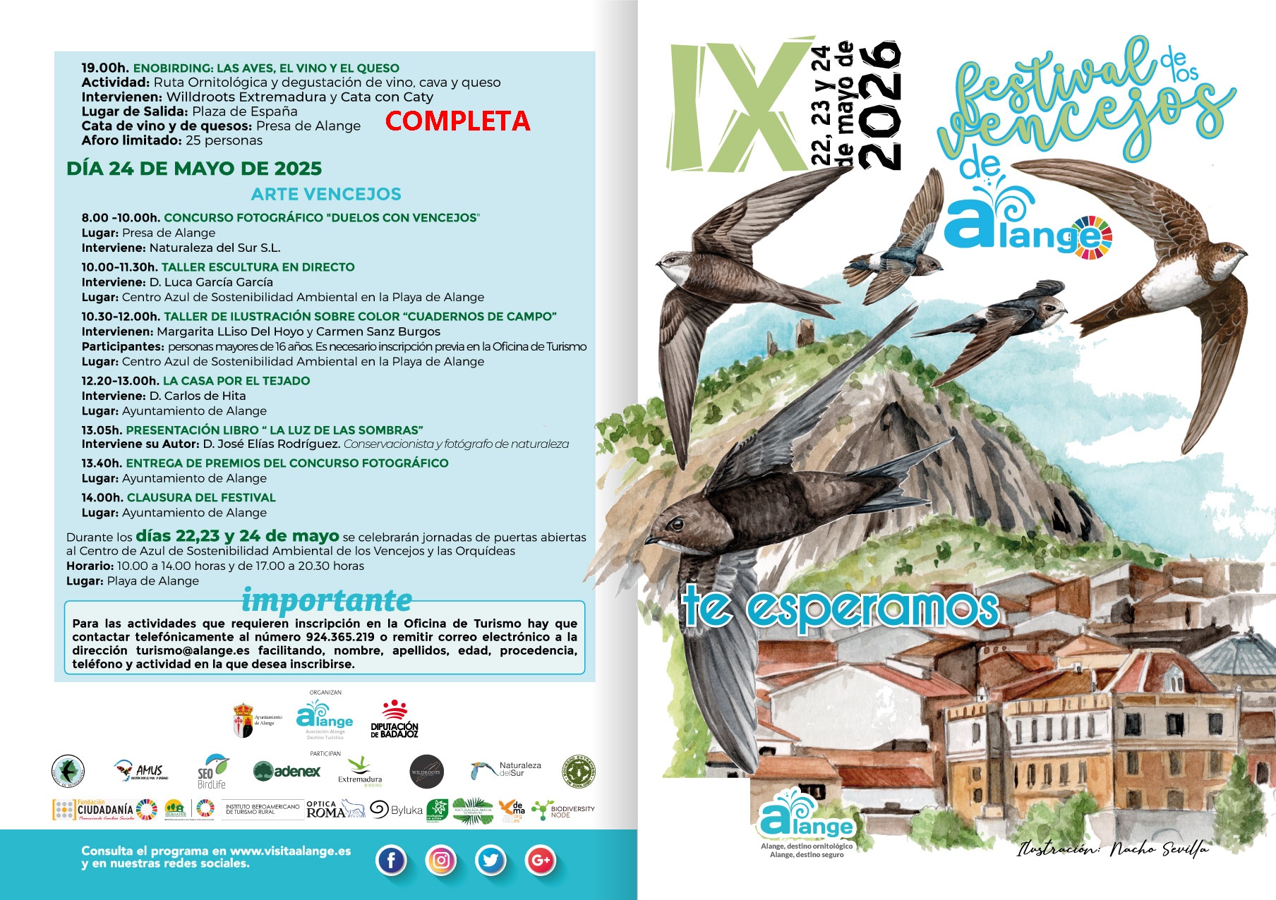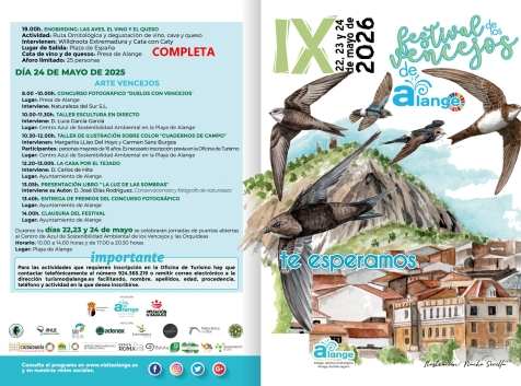 Durante los días 22, 23 y 24 de mayo, regresa una nueva edición del Festival de Los Vencejos, que en esta ocasión celebra su novena edición. Este festival es uno de los eventos más reconocidos de Alange y ha puesto a nuestra localidad en el mapa de todos los amantes de la ornitología.