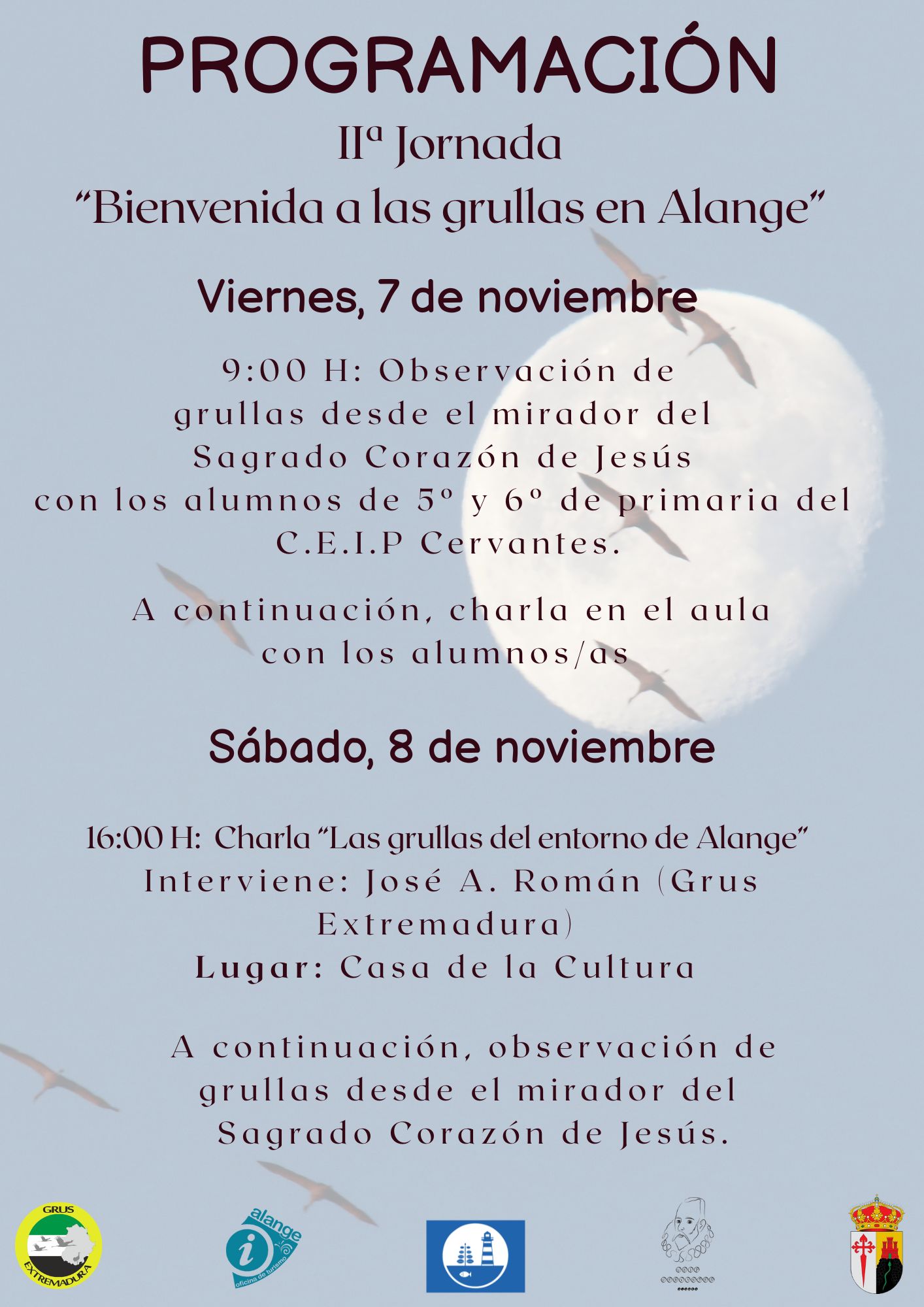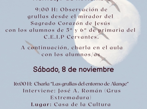 Como novedad, el viernes 7 de noviembre se celebrará una charla y actividad de avistamiento de grullas con el alumnado de 5.º y 6.º de Primaria.